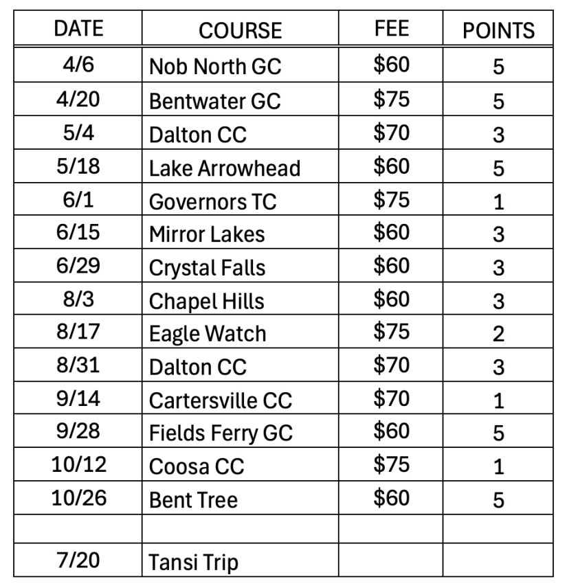 If you are interested in joining in, please let Vince DiCecco or Mark Byrd know at the first tournament (April 6th) or send an email to Vince at vdicecco@bellsouth.net or call,
